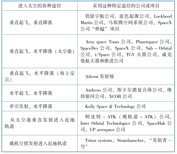维珍银河公司和蓝色起源公司并不是唯一致力于创造商业能力来使亚轨道太空飞机或发射卫星进入轨道的公司。如前所述,波音公司和SpaceX 公司也力图根据NASA 商业载人合同向国际空间站提供商业发射,内华达山脉公司继续研制其“追梦者”太空飞机,可由“宇宙神5号”等火箭发射入轨,载货并可能载人往返于近地轨道。