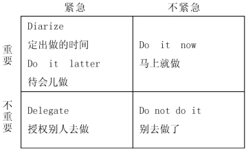 在每天的第二象限事务日程安排上,为每件要做的事设定一个特殊的时间区段,在这段时间谢绝一切无助于第二象限要事进程的事务,使自己完全投入到工作中。如果你只有两小时来写份报告,就保证这两个小时里写出一份高质量的报告。