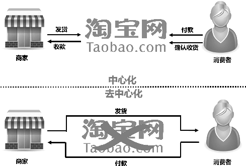 举个简单的例子。我们都有网购的经历,买家购买商品的时候,需要将钱款打给淘宝等电商平台,淘宝等电商平台充当一个中介机构,托管了买家的资金,商家看到买家付款给淘宝后去发货。等到买家收到货后,会有一个确认收货的机制,中介电商此时再将买家之前托管给其的资金转给商家。这里的淘宝平台就是一个中心化平台,这种方式在交易过程中非常烦琐,商家回款速度非常缓慢,影响资金流的可持续性。