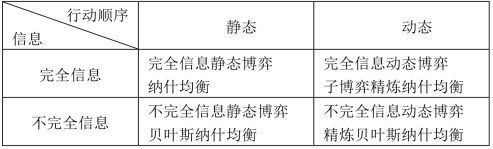 将上述两个角度的划分结合起来,就得到四种不同类型的博弈,这就是:完全信息静态博弈,完全信息动态博弈,不完全信息静态博弈,不完全信息动态博弈。与上述四类博弈相对应的是四个均衡概念,见表9-3所示,即:纳什均衡(Nash equilibrium),子博弈精炼纳什均衡(subgame perfect Nash equilibrium),贝叶斯纳什均衡(Bayesian Nash equilibrium),精炼贝叶斯纳什均衡(perfect Bayesian Nash equilibrium)。(https://www.daowen.com)