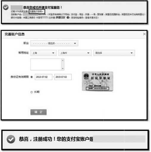 (2)开通支付宝服务成功,点击“完善账户信息”补全用户职业及身份证有效期信息,如图3-29所示;