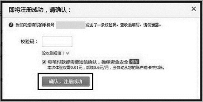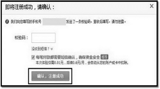 (1)姓名和身份证号码通过身份信息验证后,页面提示绑定银行卡,输入用户的银行卡卡号及该卡银行预留手机,点击“确定”,输入校验码,点击“确认,注册成功”完成开通支付宝服务且绑定银行卡成功,如图3-19和3-20所示;
