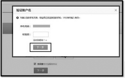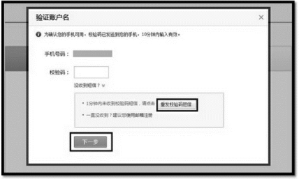 第三步,填入手机上收到的校验码,点击“下一步”(系统默认就是手机号码注册,填入的手机号如已注册过会提示“此手机号码已经被注册,请更换号码注册或登录”),如图3-15所示;