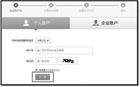 第二步,点击“个人账户”,默认选择“中国大陆”,输入手机号码和验证码,点击“下一步”,如图3-14所示;
