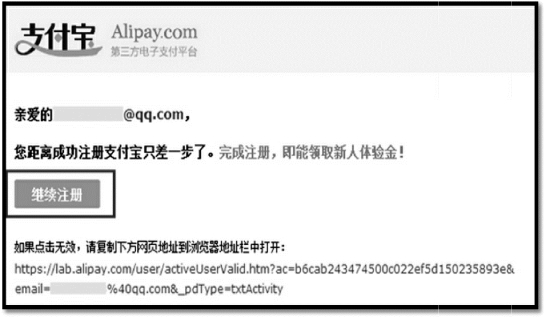 第四步,收到激活支付宝账户的邮件,点击“继续注册”,如图3-25所示;
