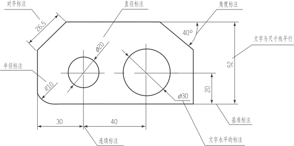 标注是向图形中添加测量注释的过程。基本的标注类型包括:线性、径向(半径和直径)、角度、坐标和弧长等。其中线性标注可以是水平、垂直、对齐、旋转、基线或连续的,如图4-25所示。