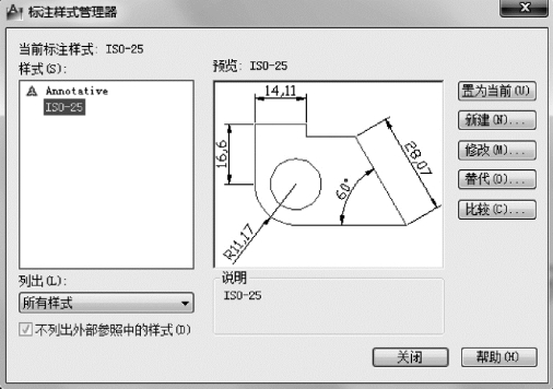 弹出【标注样式管理器】对话框,如图4-34所示。AutoCAD提供了尺寸标注的基本样式“ISO-25”作为当前标注样式。