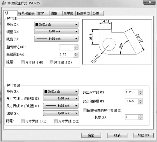 下面以修改“ISO-25”标注样式为例,了解一下标注样式的内容。在【标注样式管理器】对话框中单击【修改(M)】按钮,弹出【修改标注样式】对话框,如图4-35所示。