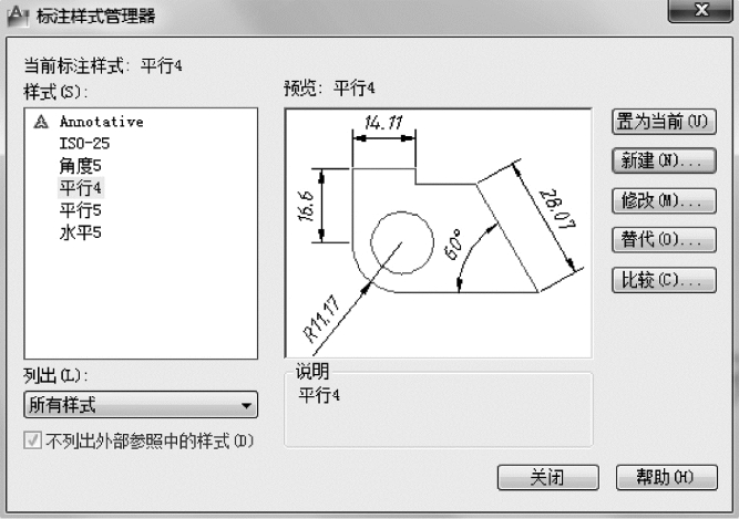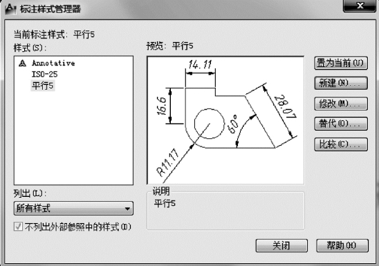 (9)设置完成后,单击【确定】按钮,返回到【标注样式管理器】对话框,在【样式(S)】框中将会出现刚设置的样式名称“平行5”,如图4-36g所示,单击【关闭】按钮,即完成“平行5”标注样式的设置。