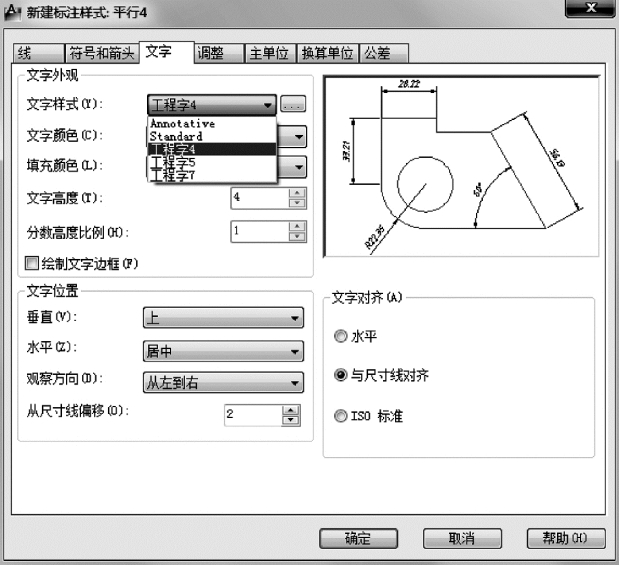 操作步骤同前,【基础样式(S)】选择“平行5”,新样式名为“平行4”。所作的修改是在【文字】选项卡中将【文字样式】改为“工程字4”即可,其余不变。单击【确定】按钮,完成“平行4”标注样式的设置。如图4-39所示。