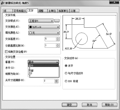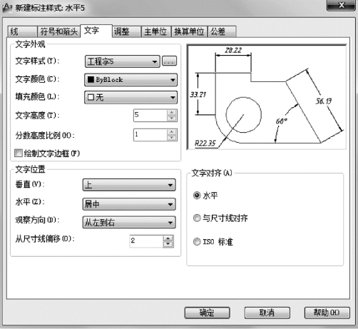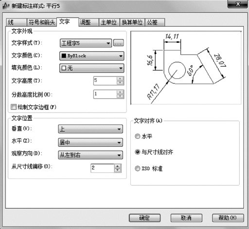(4)选择【文字】选项卡,该选项卡用于设置尺寸文本的形式、位置和对齐方式等。在【文字样式(Y)】的下拉列表中选择“工程字5”,在【文字对齐(A)】中选择“与尺寸线对齐”,【从尺寸线偏移(D)】设置为“2”,其余参数采用默认值,如图4-36d所示。