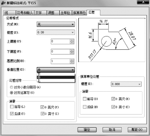 【垂直位置(S)】:用于设置偏差数字相对于基本尺寸数字的位置,有“上”“中”“下”3种选择,一般选择“中”。