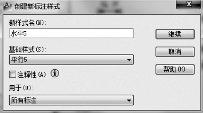 (1)执行新建标注样式的命令,弹出【标注样式管理器】对话框,单击【新建】按钮,弹出【创建新标注样式】对话框,在【新样式名(N)】框中输入要创建的新样式名称“水平5”。【基础样式(S)】选择“平行5”,单击【继续】按钮,如图4-37a所示。