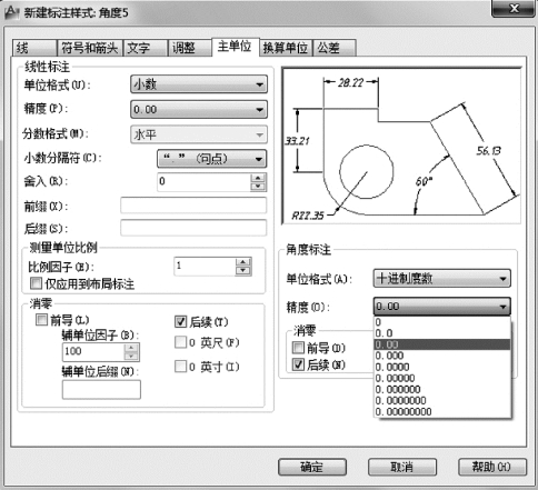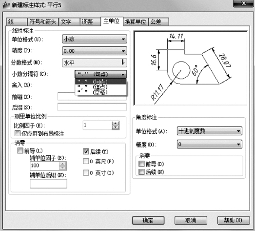 (6)选择【主单位】选项卡,该选项卡用于设置尺寸标注的主单位和精度,以及给尺寸文本添加固定的前缀或后缀。在【小数分隔符(C)】中选择“.”(句号),其余参数采用默认值,如图4-36e所示。