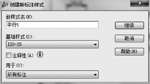 (1)执行新建标注样式的命令,弹出【标注样式管理器】对话框,单击【新建(N)】按钮,弹出【创建新标注样式】对话框,在【新样式名(N)】框中输入“平行5”。单击【继续】按钮,如图4-36a所示。