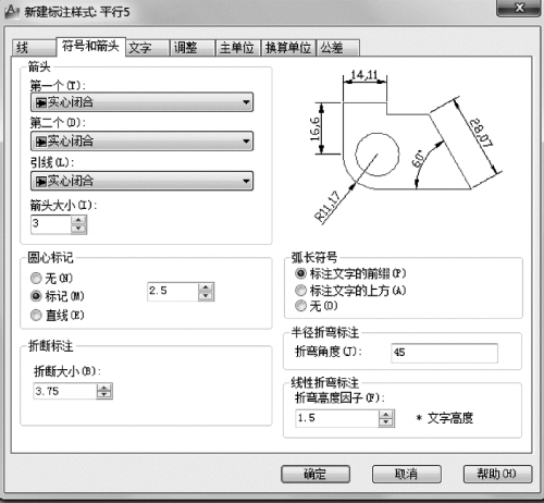 (3)选择【符号和箭头】选项卡,该选项卡用于设置箭头、圆心标记、弧长符号及半径标注折弯的形式和特征。设置箭头大小为“3”,其余参数采用默认值,如图4-36c所示。