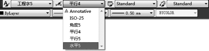 设置当前标注样式的最快捷的方法是,在图4-41所示的【样式】工具栏中,单击【标注样式控制】按钮,选择某一种标注样式即可,选中的标注样式即作为当前标注样式显示在【样式】工具栏中。