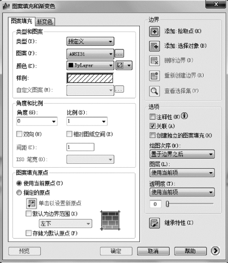 单击【绘图】工具栏中的【图案填充】按钮,弹出【图案填充和渐变色】对话框,在【类型和图案】选项组的【图案】下拉列表框中,选择“ANSI31”,在【边界】选项组中,单击【添加:拾取点】按钮