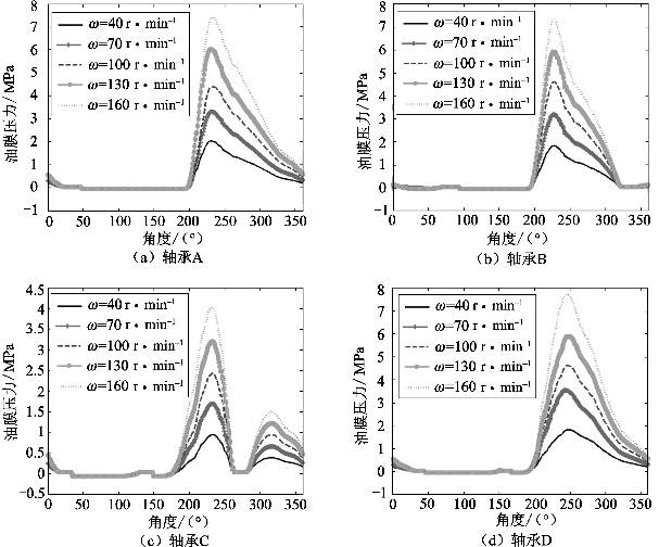 图5.4.11描述了曲轴转速对轴承油膜压力分布的影响。从图5.4.11中可以看出,不同曲轴转速下油膜压力分布趋势基本相同,随曲轴转速的增加,油膜最大压力明显增大。相对偏心率对油膜压力的影响,油膜压力大小受转速影响发生类似变化,轴承C的最大油膜压力值明显低于其他三种轴承。由图5.4.11(c)可知,虽然油膜最大压力值随转速的增加而增大,但在高压区内依然出现低压值。当转速为40 r/min时,轴承C的油膜最大压力为0.944 MPa。当转速上升到160 r/min时,油膜最大压力为4.03 MPa。由图5.4.11(d)可以看出,转速从40 r/min增长到160 r/min,油膜最大压力从1.81 MPa增大到7.72 MPa,增长幅度很大。因此,可以发现转速对油膜压力分布影响较小,但对最大压力值影响很大。