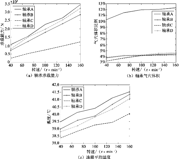 轴承承载能力随转速变化曲线如图5.4.12(a)所示,计算结果表明不同结构的轴承承载能力变化趋势基本相同。由计算结果可以看出,相同转速时,油槽数量越多,轴承承载能力越小。同时还可以发现,四种轴承的油膜承载能力随转速的增大都有所增大,但增大幅度有所差别。对比A和C两种轴承可以发现,转速对轴承C的影响较小,引起这种现象的原因是轴承C的油膜压力值变化较小。进一步,对比轴承B和轴承D的承载能力变化曲线可知,轴承B承载能力较低,这是由于油槽在收敛区内降低了轴承B的油膜压力,由此可见轴承油槽位置的变化会引起轴承承载能力的改变。图5.4.12(b)描述了曲轴转速对油膜气穴体积的影响。对比图中曲线可以看出,不同结构的轴承油膜气穴体积均随转速的升高而增大,轴承A的气穴体积分数明显高于其他三种轴承。当转速达到160 r/min时,轴承A的气穴体积达到最大。相对偏心率对轴承气穴体积分数的影响,转速对气穴体积分数影响较小。当转速为40 r/min时,轴承A气穴体积分数为10.28%。当转速增加到160 r/min时,轴承A气穴体积分数为12.28%。这是由于更多气体状态出现在发散区,破坏了流体的连续性,流场的发散区域增大。轴承B、轴承C和轴承D三种气穴体积分数曲线变化接近一致,尤其在高速状态下基本相同。气穴体积分数的增加会引起润滑黏度的降低,从而会降低轴承的润滑能力。从图5.4.12(c)可以得出曲轴转速对轴承平均温度影响较大。结果表明:在相同转速的工况下,油槽数量越多,油膜平均温度越低。当轴承转速为160 r/min时,轴承A油膜平均温度为41.53℃,而轴承D油膜平均温度为41.06℃。