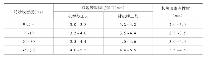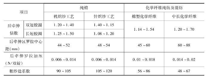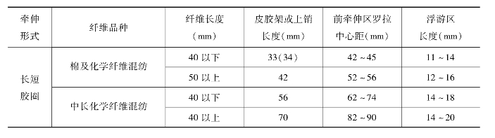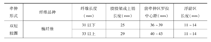 (3)前牵伸区是细纱机的主要牵伸区,为采用较大牵伸倍数,应尽量形成合理的附加摩擦力界。前牵伸区工艺的选择一般根据所用原棉的品质及喂入半制品的质量情况、后牵伸倍数、纺纱线密度、产品质量要求、前牵伸区对纤维的控制能力等决定。相关的工艺参数参见表2-13~表2-15。