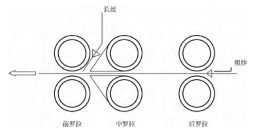 (3)赛络菲尔纺。赛络菲尔纺与赛络纺类似,如图2-5所示,只是它将赛络纺中的一根粗纱换成长丝。它是传统环锭细纱机上加装一个长丝喂入装置,使长丝在前罗拉处喂入时与经正常牵伸的须条保持一定间距,并在前罗拉钳口下游汇合加捻成纱。
