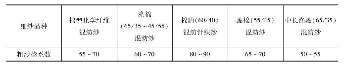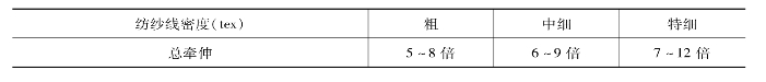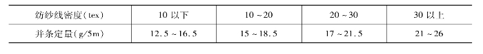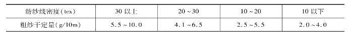 棉条定量应根据生条定量、纤维种类和产品质量要求等因素加以确定。不同纺纱线密度时棉条定量选用参见表2-6。