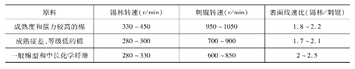 (2)化学纤维长度长,其刺辊与锡林的转移速比应比棉纤维大,一般在2以上,以利于转移。此外,各点的隔距也应较加工棉纤维时大。