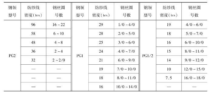 (3)钢丝圈型号的选择可参见表2-16。如果钢丝圈重心位置高,则纱线通道通畅、钢丝圈拎头轻,但因磨损位置低,易飞钢丝圈,并且可能碰钢领外壁而引起纺纱张力突变;如果钢丝圈重心位置低,其运转稳定,但纱线通道小而拎头重。钢丝圈号数,除了纺制富有弹性的纱之外,在细纱可以承受的张力范围内,一般选用稍重的钢丝圈,以保持气圈的稳定性,特别是对减少小纱断头有显著效果。但如果钢丝圈过重,反而会增加断头。大纱时的气圈张力可以通过调节导纱钩动程来解决。