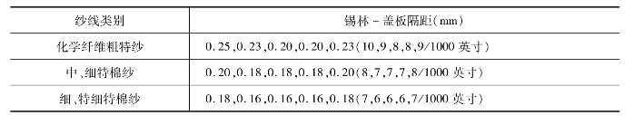 (4)隔距。隔距主要决定分梳的程度。隔距小,则分梳作用强,但容易造成纤维损伤和杂质破碎;隔距过大,纤维容易在针面间搓转,形成棉结。隔距主要根据纤维层厚度和纤维长度确定,棉层厚、纤维长,则隔距应大。在可能的情况下,隔距以小为宜,以利于针面握持纤维,方便纤维的转移。常用锡林~盖板隔距参见表2-4。