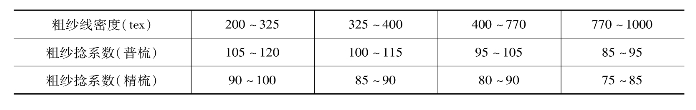 当纤维长、整齐度高、线密度小、粗纱线密度大时,捻系数应小,细纱后区牵伸工艺直接影响成纱质量,生产中往往调整粗纱捻系数来协助细纱机后区牵伸工艺的调整。当细纱机的牵伸机构完善、加压条件好时,粗纱捻系数可偏大掌握。此外,粗纱捻系数对气候条件比较敏感,气候潮湿,粗纱发涩,捻系数应小;气候干燥,纤维发硬,捻系数应大。但有些地区在梅雨季节,粗纱与机件的摩擦系数大,前罗拉锭翼顶端的纱条下坠严重,粗纱发烂,此时捻系数应增加;而在寒冷季节,粗纱与机件的摩擦系数小,捻系数减小,卷绕成形正常。捻系数的选择参见表2-10和表2-11。