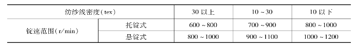 (2)锭速。锭速主要与纤维特性、粗纱卷装、捻系数、锭翼形式和设备性能等有关。化学纤维纯纺、混纺时,由于粗纱捻系数较小,锭速要降低20%~30%。纯棉粗纱锭速选用范围参见表2-8。