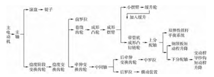 细纱是纺纱的最后一道工序,细纱工序将粗纱加工成一定线密度且符合一定质量要求的细纱。细纱工序需要完成牵伸、加捻和卷绕成形,以FA506型细纱机为例,其传动系统如图2-3所示。