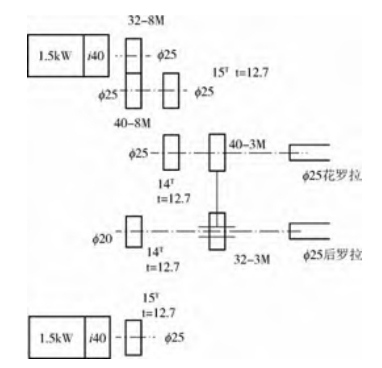 ③把组装好的轴按原样装回到机头上,并把拆掉的各齿轮安装复位。(注:原车右蝴蝶牙不用,改为竹节纱装置厂家提供的带轴承的蝴蝶牙)