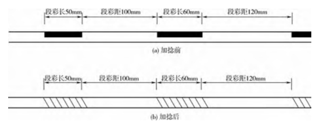 注:段彩竹节纱参数设定方法跟段彩平纱参数设定方法相似,只是节长部分总粗度有所变化,段彩竹节纱的节粗计算公式为: