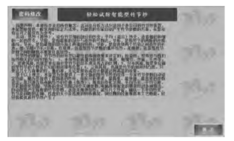 (1)在图2-9所示屏幕的右下角有两个显示框,分别为安全等级和输入密码。按下输入密码下面的,在屏幕上便显示一个操作键盘,输入1级密码后,按下确认,左边的安全等级自动变成1;如输入2级密码后,左边的安全等级便自动变成2(其中2级密码为最高密码),所有的子菜单将处于解密状态,任意进入,随意修改。其中,0级密码可任意进入子菜单,1级密码(在高于1级密的状态下)可以进入如下子菜单。