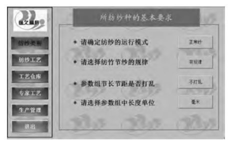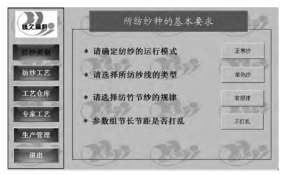 ①纺纱类别:选择所纺纱是正常纱还是竹节纱、选择所纺纱是单色纱还是花色纱、纺纱参数组有无规律变化、节长节距是否打乱。