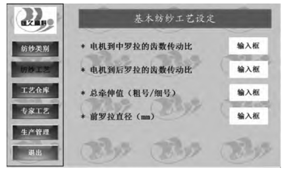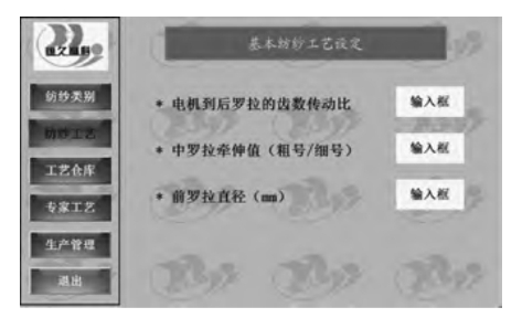 ③纺纱工艺:传动比(电动机到后罗拉的齿数传动比)、牵伸(基纱总牵伸值)、前罗拉直径。