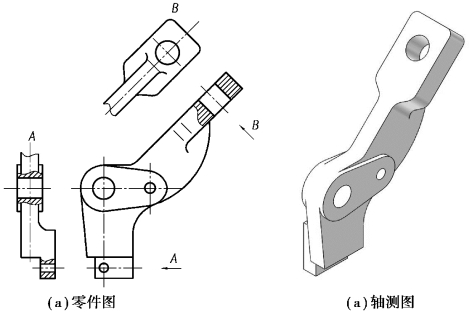 如图8.5所示的机械臂零件图的表达方案,是按上述步骤,经分析、比较几种表达方案后确定的。如图8.5(a)所示是机械臂的轴测图,可基本了解机械臂的作用。如图8.5所示的机械臂表达方案,共用了一个基本视图、一个局部视图和一个斜视图。其中,主视图采用了局部剖视图的表达方法;A向为右视方向的局部视图;B向为从右下往左上斜视投影的斜视图。此方案视图数量较少,避免了虚线,未出现表达形状的重复,故为该机械臂表达较好的方案。