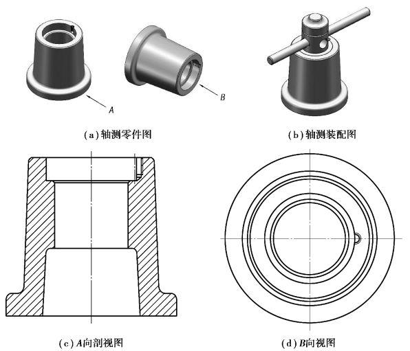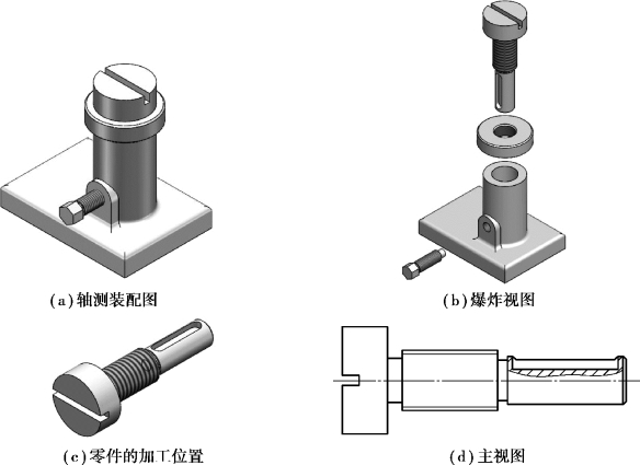 零件的加工位置是指零件在机床上加工时的装夹位置。主视图方位与零件主要加工工序中的加工位置相一致,便于看图、加工和检测尺寸。因此,对于主要是在车床上完成机械加工的轴套类、轮盘类等零件,一般要按加工位置即按其轴线水平放置来选择主视图投射方向。如图8.4(a)、(b)所示的微型千斤顶,顶杆零件属于轴套类零件,如图8.4(d)所示是顶杆零件的主视图,符合该零件的加工位置原则,即在车床上加工时,该零件需要按其轴线水平放置进行装夹。